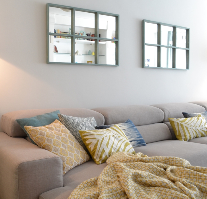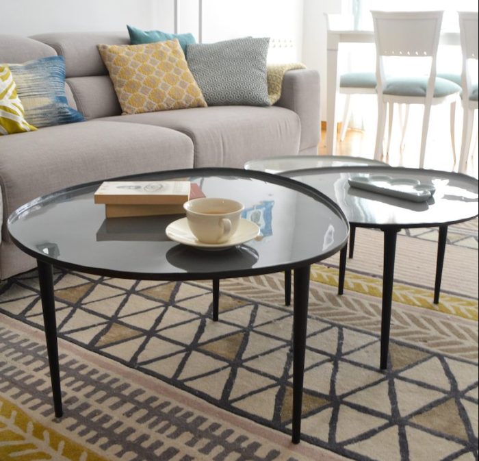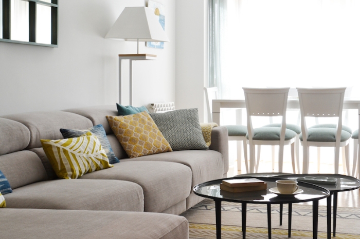 El set de mesas de centro Galet de Maisons du Monde, ayudarían a romper el orden longitudinal de la estancia y las lámparas de pie Kenneth acotarían la zona de estar. Finalmente, se optó por colocar dos espejos de Kenay Home sobre el sofá para, de nuevo, reforzar la entrada de luz natural y crear la sensación de un espacio más amplio.