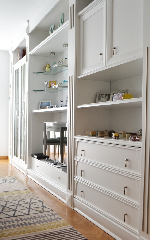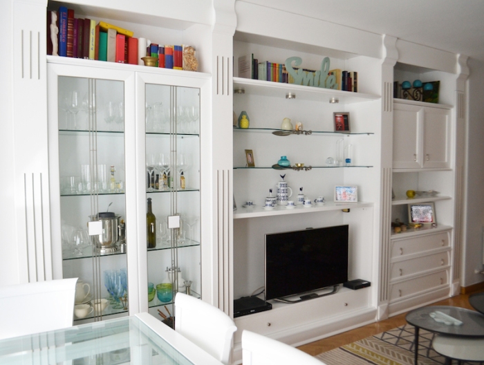 La siguiente decisión importante, fue mantener la gran estantería que ocupaba toda una pared, pero con dos modificaciones que transformarían el salón por completo. Por un lado, había que igualar en profundidad el módulo central al resto del mueble (esto haría que la habitación pareciera más ancha); y por otro, y esta fue, la GRAN decisión, se lacaría todo el mueble en color blanco para ganar luz. Como además, nuestros clientes querían mantener los muebles del comedor (mesa y sillas), decidimos que la mejor opción era también lacarlos.
