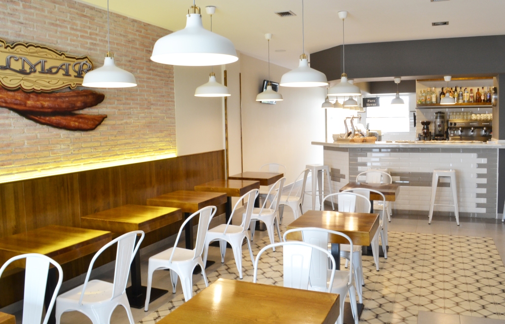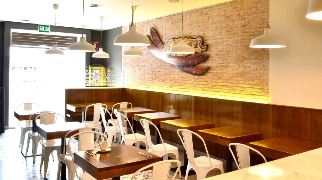 Además, creamos otro elemento (que junto a la barra) es el otro protagonista del local: una pared de ladrillo visto con iluminación indirecta tras la bancada de madera, le da mucha calidez al espacio. Unas sencillas lámparas blancas iluminan la sala, ayudan a aligerar el conjunto y encajan a la perfección con esa pincelada industrial del local.