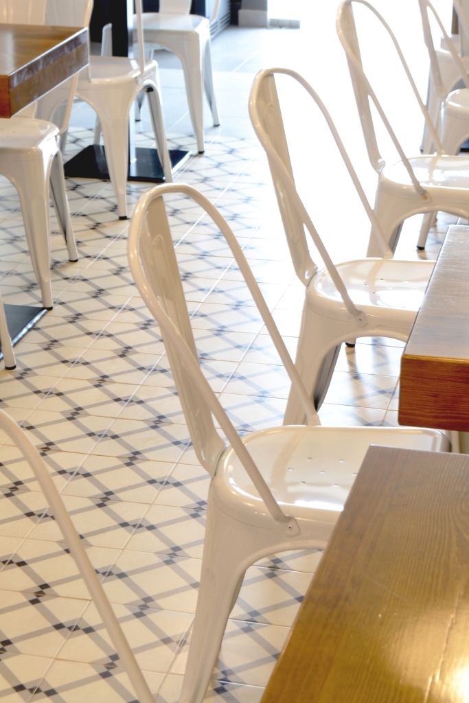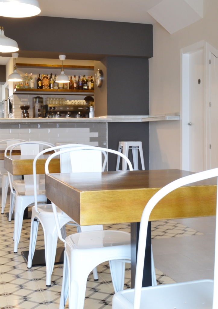 Los suelos juegan con dos tonos de gris y un alfombrado central decorativo a tono en la zona de mesas. Éstas son de madera, cuadradas y con pie metálico negro. Para las sillas nos decidimos por un icono del diseño industrial; unas Tolix de color blanco… que además son comodísimas.